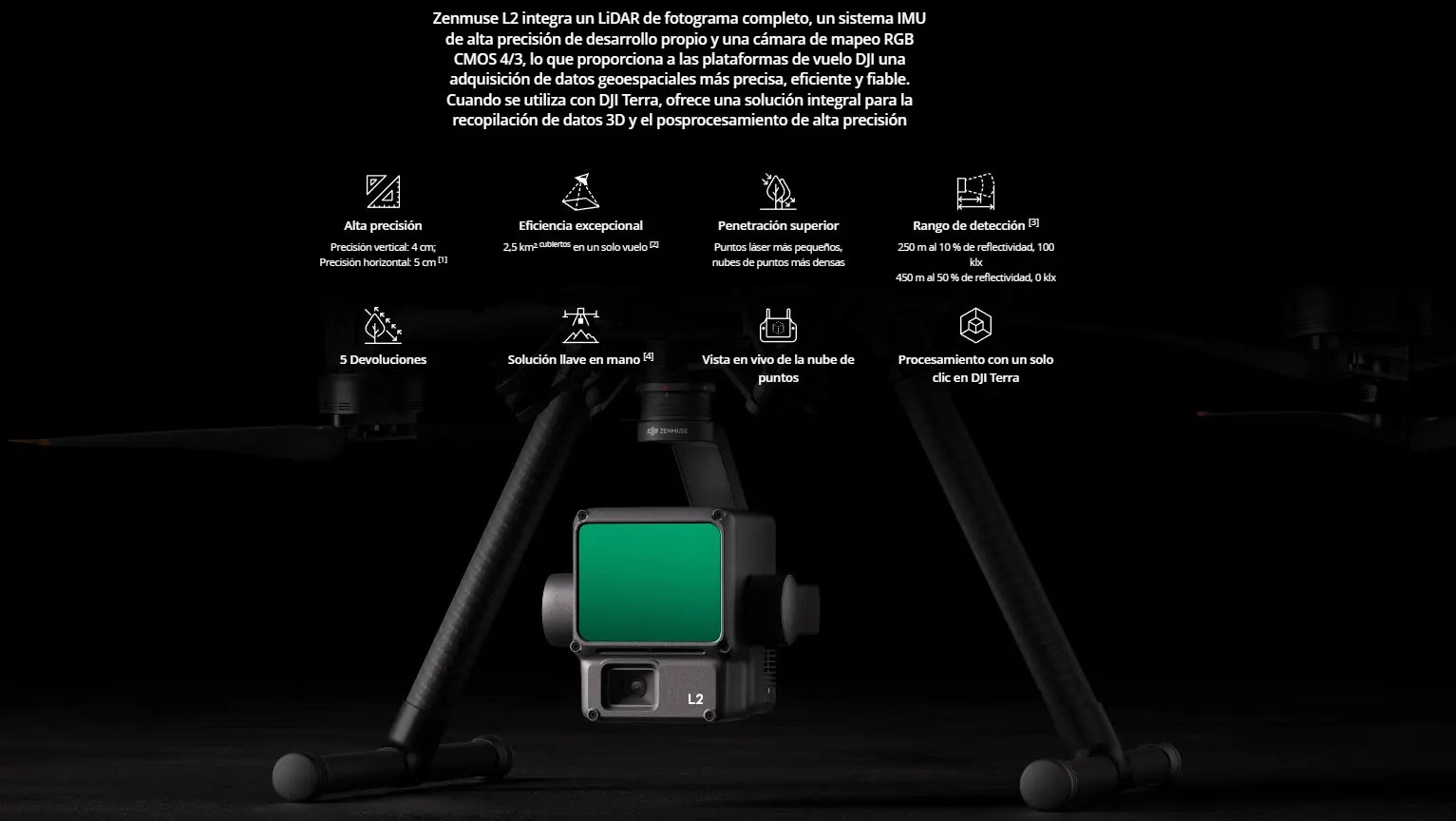 El drone Matrice 400 RTK con el sensor Zenmuse L2 es una solución aérea de alta precisión diseñada para topografía, cartografía y levantamientos 3D profesionales. Combina un sistema RTK de nivel centimétrico con el LiDAR L2 de nueva generación, logrando nubes de puntos densas, limpias y detalladas incluso en entornos complejos. Su plataforma robusta, autonomía extendida y transmisión avanzada garantizan operaciones seguras, eficientes y confiables para trabajos técnicos de máxima exigencia.